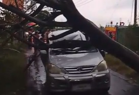 “Terjadi pohon tumbang yang mengenai mobil hingga atapnya ambruk. Korban satu orang, mengalami luka di kepala dan sudah dibawa ke RS Gambiran,” ujarnya.